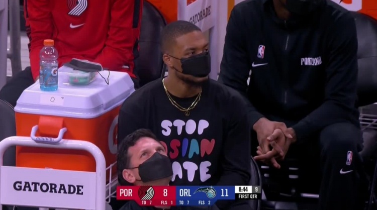 相关链接→利拉德身着“停止仇视亚裔”T恤观战 林书豪感谢其支持