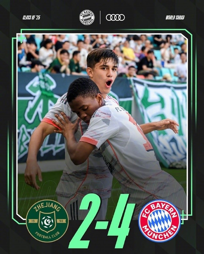 拜仁官博介绍写道:“全场比赛结束,最终拜仁世界队2025 4-2战胜浙江FC U21,恭喜小伙子们!”