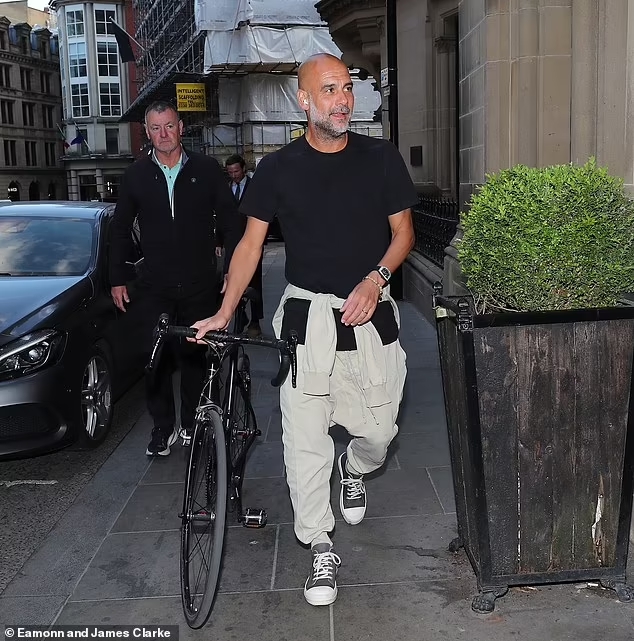 主帅瓜迪奥拉骑着自行车汗流浃背地来到派对现场。